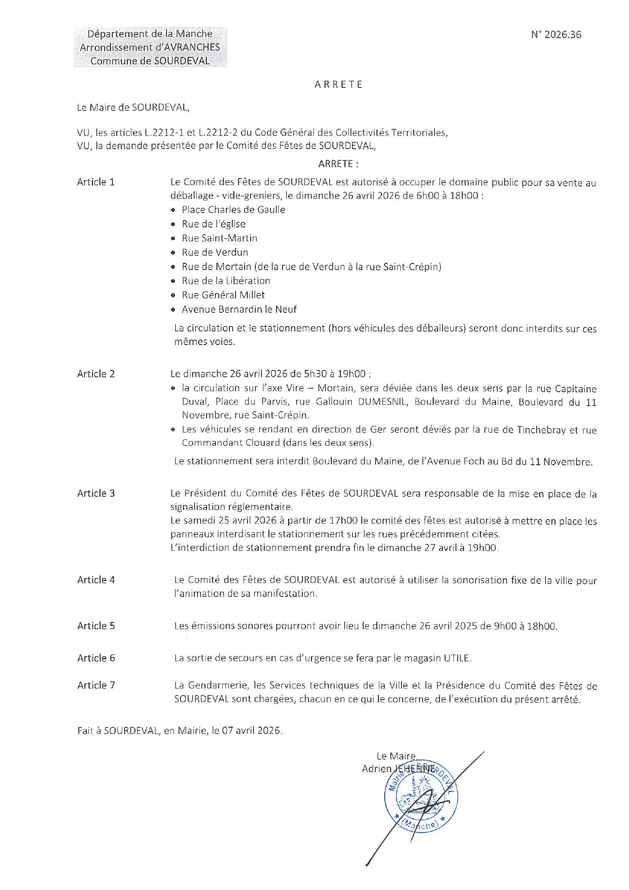 | Article 1 | Le Comité des Fêtes de SOURDEVAL est autorisé à occuper le domaine public pour sa vente au déballage – vide-greniers, le dimanche 26 avril 2026 de 6h00 à 18h00 :